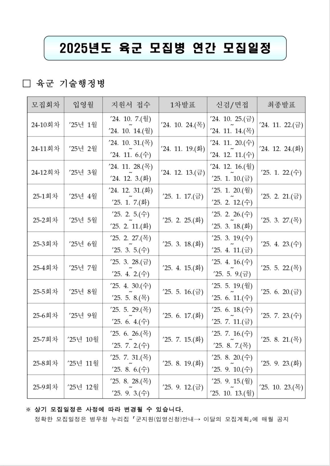 2025년도 각 군 병 모집일정을 정리하였습니다.