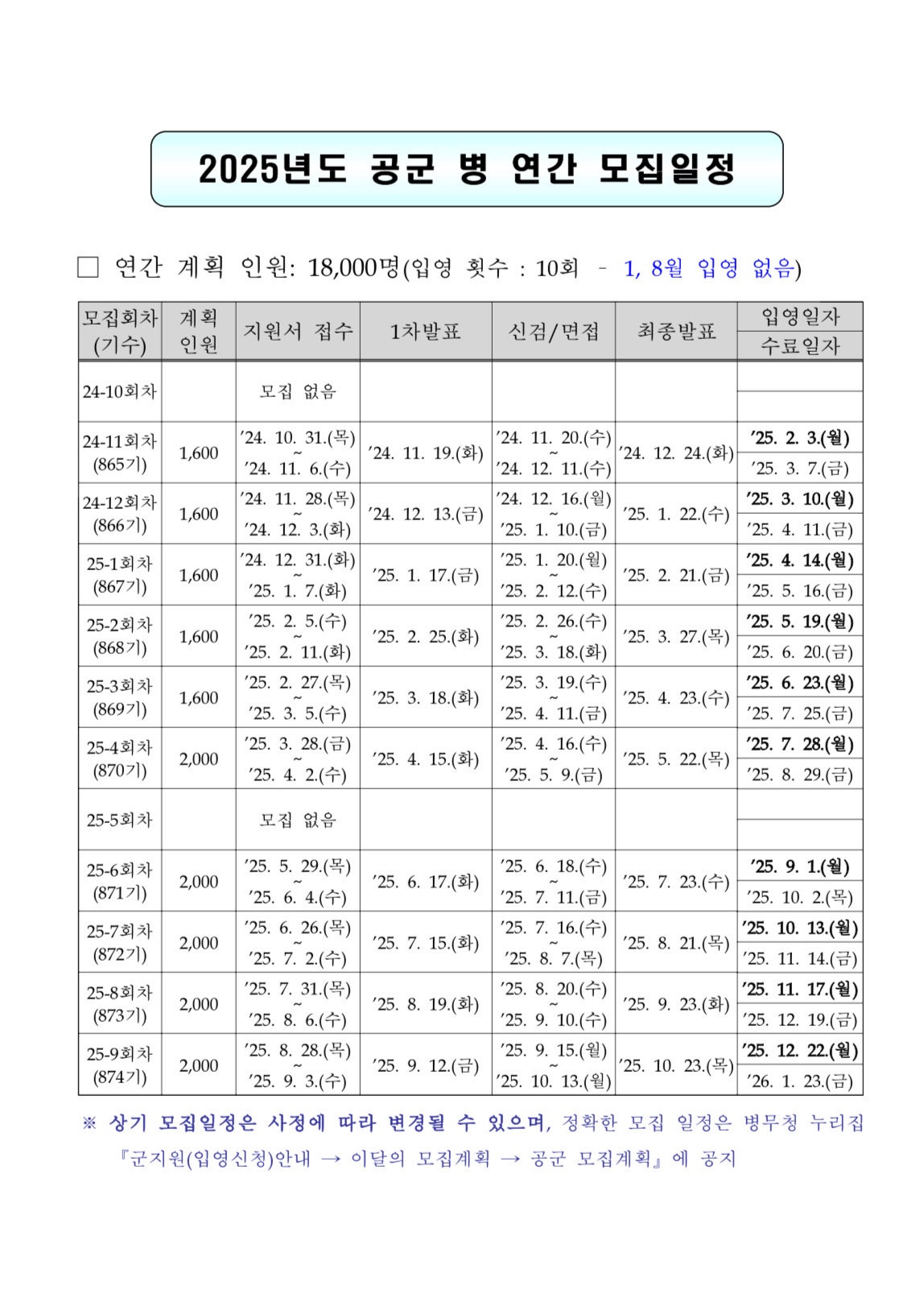 2025년도 군 병 모집일정 안내 (공군 / 육군 / 해군)