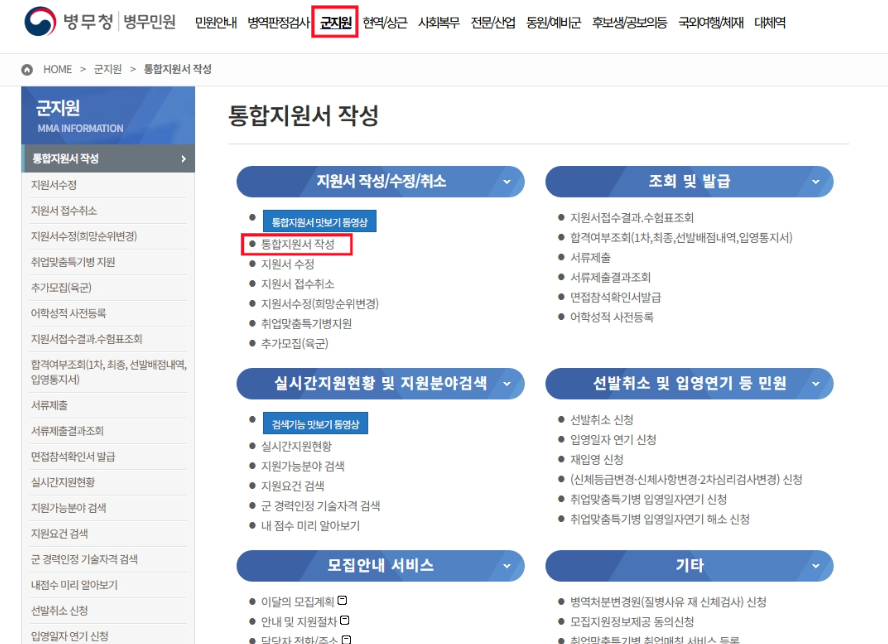 - 병무청 누리집 → 병무민원포털 → 군지원 → 지원서 작성ㆍ수정ㆍ취소 → 통합지원서 작성