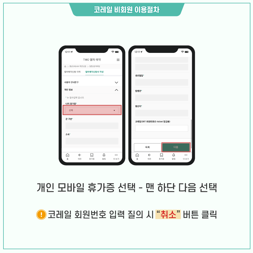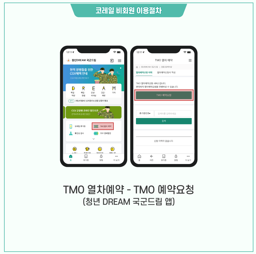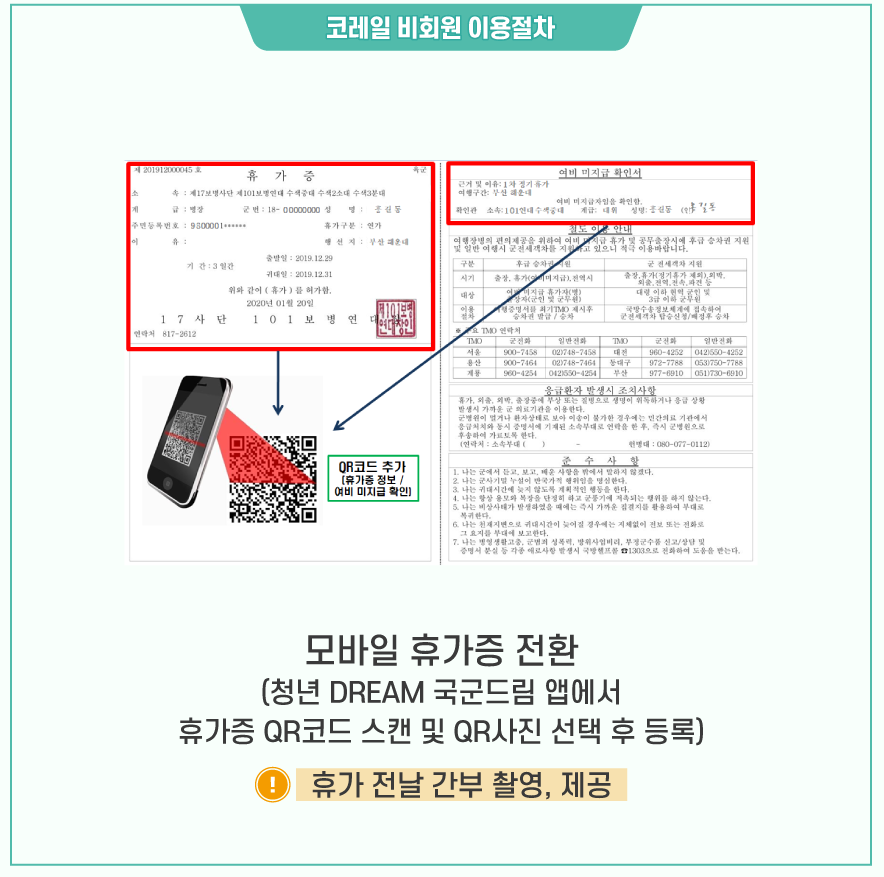 - 청년DREAM 국군드림 앱 실행 후 QR 휴가증 스캔 → 모바일 승차권 발급 → TMO 방문 없이 열차 철도 예약 및 모바일 승차권 발급 탑승 가능