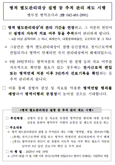 - 병역처분 원인 질병 치료 여부를 최대 3년간 추적 관리