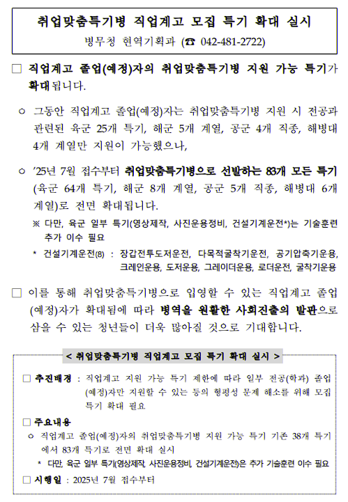 - ✅ 더 많은 직업계고 졸업(예정)자가 취업맞춤특기병으로 입영 가능