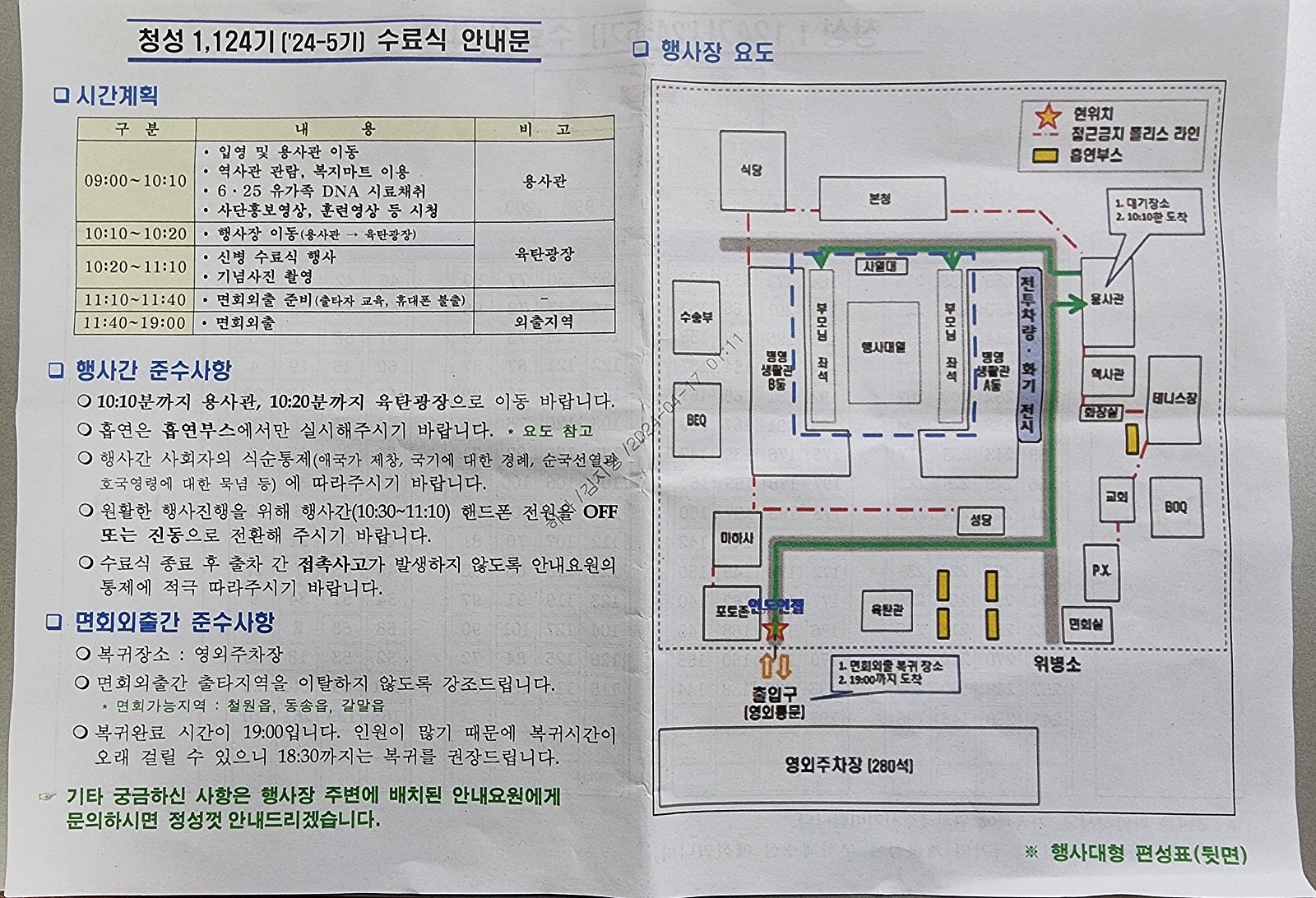 - 부대 정문은 입구/출구가 다름 (입소일 및 수료식 당일 모두 진입 가능)