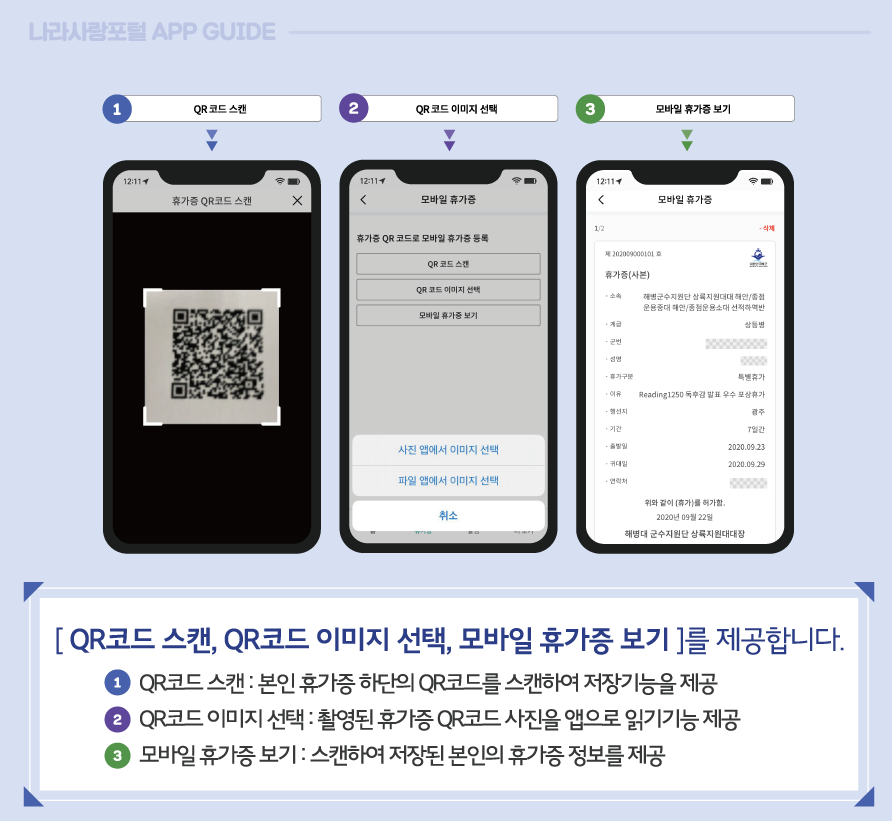 스마트폰에 나라사랑포털 앱을 다운 후에 카메라로 QR코드를 찍거나 이미지를 등록하면 자동으로 앱에 모바일 휴가증이 발급