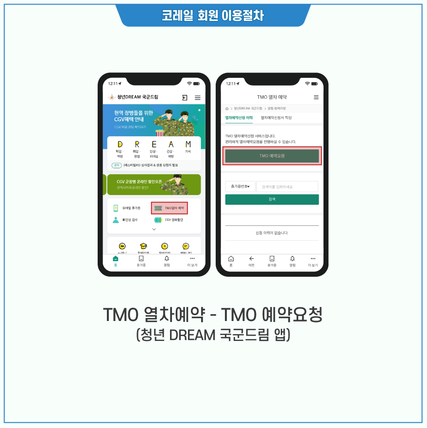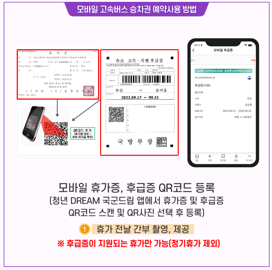 - 청년DREAM 국군드림 앱 실행 후 QR 휴가증 스캔 → 모바일 승차권 발급 → TMO 방문 없이 열차 철도 예약 및 모바일 승차권 발급 탑승 가능