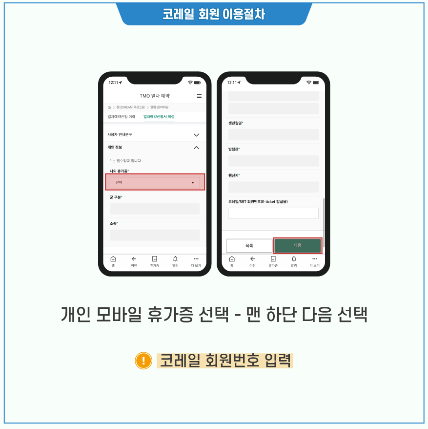소속, 계급, 군번, 휴가(출장)증 번호, 이용희망 열차/구간, 코레일톡 회원번호(숫자 10자리) 휴대 전화번호를 전달하면 코레일 앱을 통해 승차권을 수령