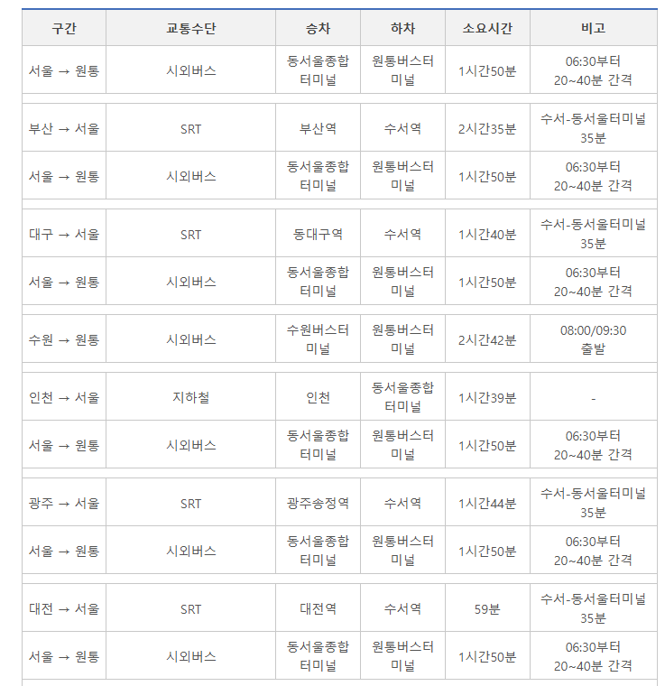 ※ 출발 전 시간표 및 예매는 코버스, 시외버스터미널, 코레일 등을 통해 확인하세요.