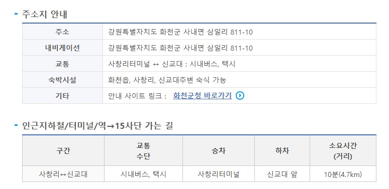 - 주소: 강원도 화천군 사내면 수밀리길 234 (삼일리 811-10)