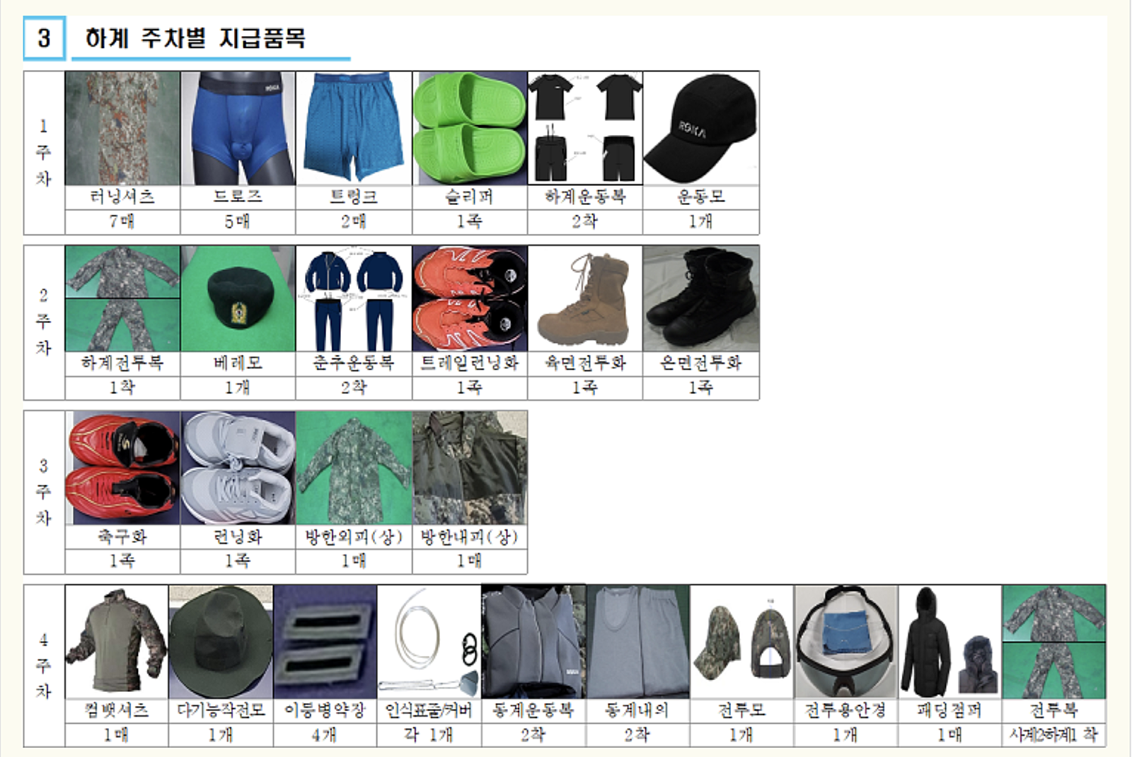 - 2~4주차: 전투복, 패딩, 다기능작전모, 전투화 등