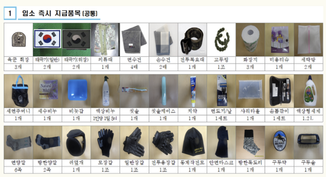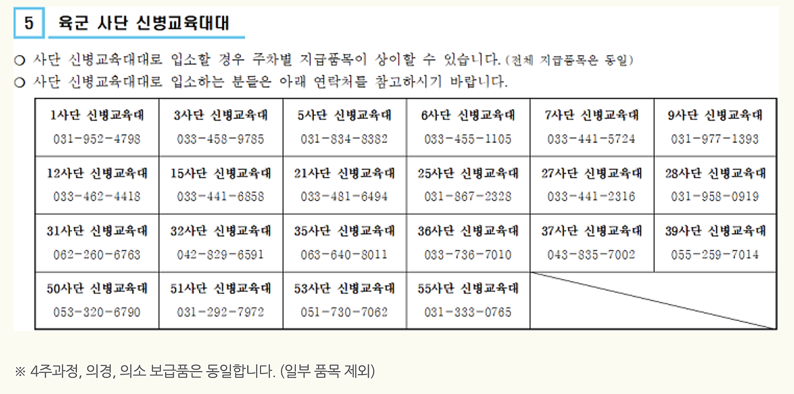 훈련소마다 지급품이 일부 다를 수 있으니, 사전에 확인하세요!
