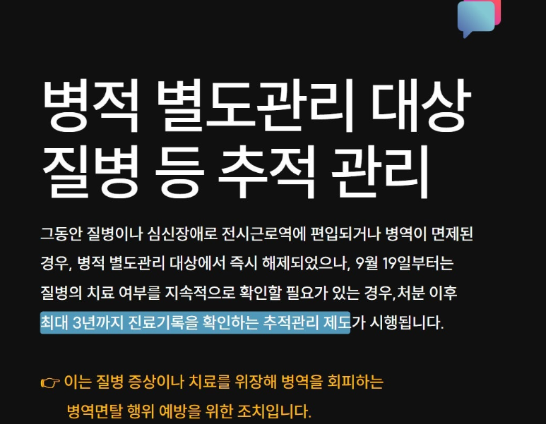 | 병적 별도관리 | 면제 시 즉시 해제 | 최대 3년간 추적 관리 |