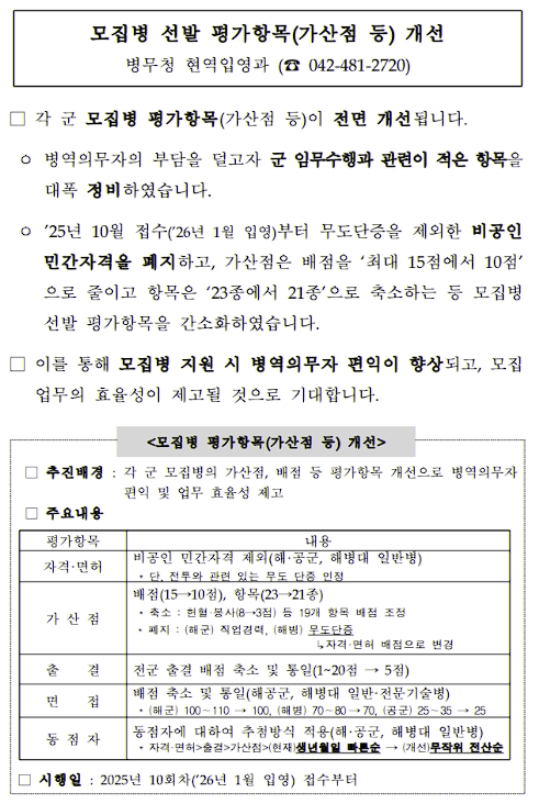 👉 군 복무와 직접적 연관이 없는 스펙 경쟁을 줄이고, 실질적 요소 중심으로 개선되었습니다.